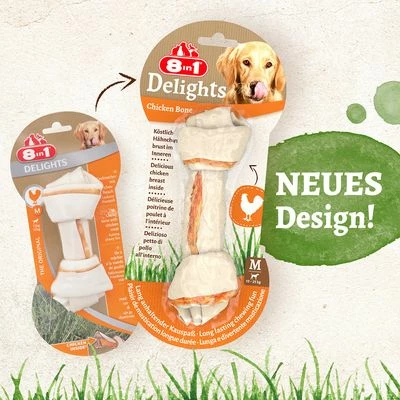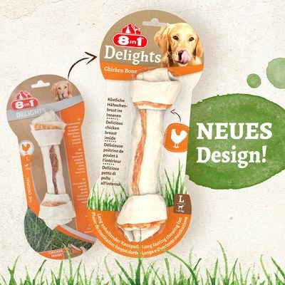 8in1 Delights Kauwbotten, smakelijk kippenvlees omhuld met taaie runderhuid, geurloos, zonder kunstmatige kleur- en smaakversterkers, verschillende maten verkrijgbaar.