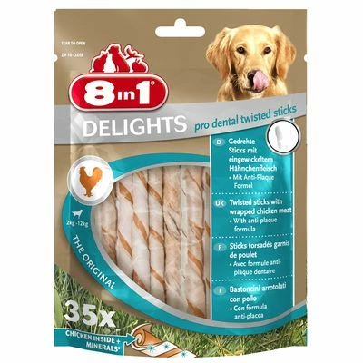 8in1 Delights Pro Dental Twisted Sticks zorgen met hun gedraaide vorm en lekker kipvlees voor veel kauwplezier. Naast de in de sticks bevattende mineralen, die de tanden reinigen, kan de anti-plaque formule lastig plaque verwijderen. Hiermee wordt ook de vorming van nieuw tandsteen tegengewerkt. Op basis van hun vorm garanderen de kauwstangen vooral ook voor kleinere honden met weinig bijtkracht veel kauwplezier gedurende een lange tijd. De Twisted Sticks worden volgens een patentrecept van 8in1 geproduceerd en bevatten voor het welzijn van uw hond maar 2% vet. Verras uw hond met dit lekkere kauwplezier, die de adem van uw hond kan verfrissen en tandplaque kan verminderen!