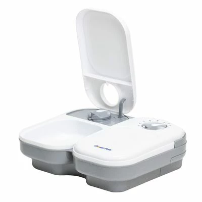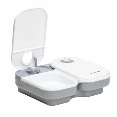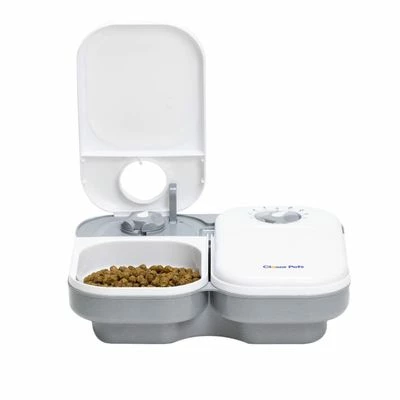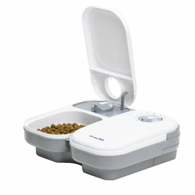 Automatische voerbak voor katten & kleine honden. Voor 2 x 400 ml nat- of droogvoer. 48-uurs timer maakt het mogelijk de 2 deksels te openen. Voerbakjes vaatwasmachinebestendig. Werkt op batterijen.