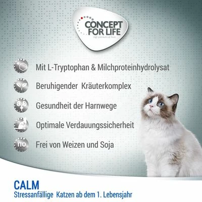 Concept for Life Calm is een compleetvoer voor stressgevoelige katten. Het bevat gehydrolyseerd melkeiwit, van nature lactosevrij (alpha-S1 caseïnaat), en L-tryptofaan, die helpen tijdens periodes van stress. Daarnaast bevat het een mengsel van hopbloemen, citroenmelisseblaadjes, passiebloem en sint-janskruid dat bijdraagt ​​aan ontspanning. Bovendien bevat het DL-methionine, dat de pH van de urine verlaagt en de gezondheid van de urinewegen kan ondersteunen. Dit voer bereikt een optimale verteerbaarheid en de prebiotische inuline bevordert de gezondheid van de darmflora. STAY-Clean™-complex, met vitamine C, vermindert de groei van tandplakvormende bacteriën.