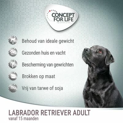 Concept for Life is een hoogwaardig compleetvoer voor volwassen Labrador Retrievers, dat in verpakkingen van 1,5 kg, 6 kg (4 x 1,5 kg) en 12 kg verkrijgbaar is.