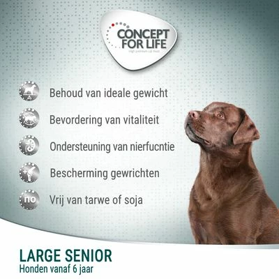 Concept for Life is een uniek, wetenschappelijk voedingsconcept voor een rondom gezond hondenleven. De soort Large Senior biedt een op uw oudere hond aangepaste soortgerechte en evenwichtige voeding.