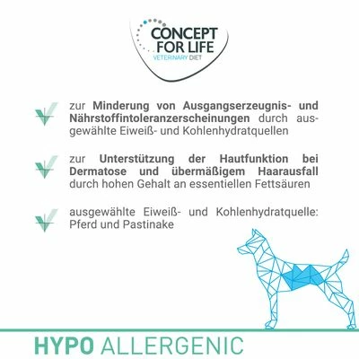Concept for Life Veterinary Diet Hypoallergeen is een speciaal ontwikkeld premium-dieetvoer wat dient als compleetvoer voor volwassen honden en de behoeftes van honden met voedingsonverdraagzaamheden ideaal kan ondersteunen.