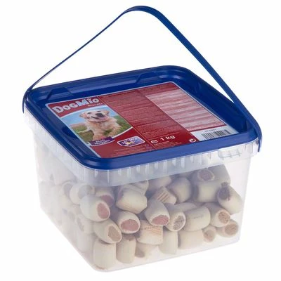 Lekkere hondenkoekjes gevuld met gevogelte, kaas en zalm, een smakelijke beloning van hoogwaardige ingrediënten, ondersteunt de gebitsreiniging – in handige bewaardoos – geliefd bij honden!