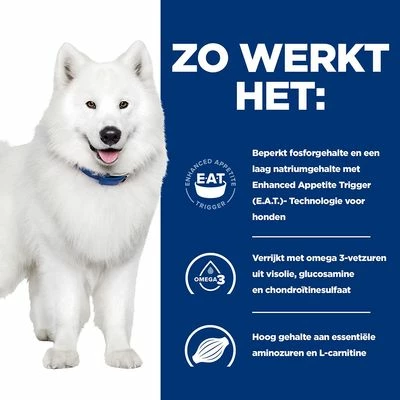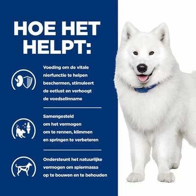 Dieetvoer voor volgroeide honden met nierinsufficiëntie of met osteoartrose, verbeterd de nierfunctie en bevordert levendigheid & mobiliteit, laag fosforgehalte.
