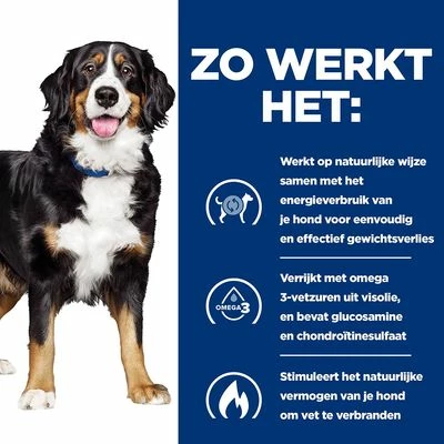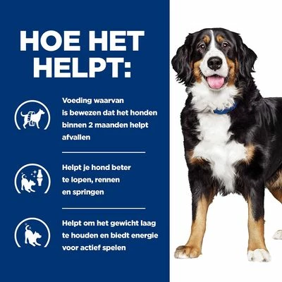 Dieetvoer met klinisch bewezen formule voor volwassen honden. Biedt ondersteuning bij neiging tot overgewicht & artrose. Met laag energiegehalte, omega 3-vetzuren & vitamine E.