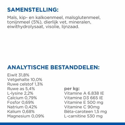 - Laag vetgehalte en hoog L-lysinegehalte: kan de vitaliteit van uw kat ondersteunen