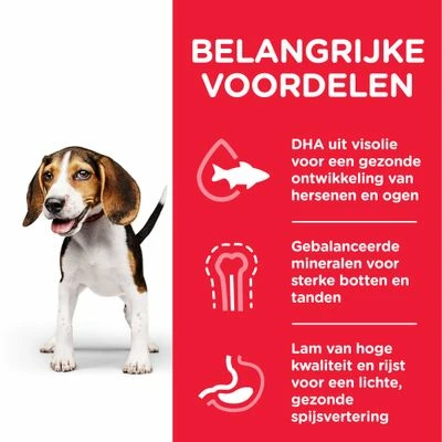 Hondenvoer Hill’s Canine Puppy met Lam & Rijst Healthy Development is ideaal puppyvoer voor pups, jonge honden en drachtige resp. zogende teven