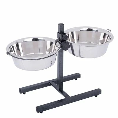 De hondenbar met roestvrijstalen voerbakken maakt het eten voor alle grote en oude honden makkelijker. De houder van de dubbele voerbak kan traploos in de gewenste hoogte worden ingesteld. Zo kan uw hond in een comfortabele houding in de voor hem optimaal ingestelde hoogte ontspannen eten en drinken, zonder zich te ver naar voren te moeten buigen. Daardoor voorkomt de hondenbar bij uw hond pijnlijke verrekkingen bij het eten en ontziet de gewrichten van de voorpoten en zijn tussenwervels. Door de horizontale houding van de kop bij het eten hangen de oren van langorige hondenrassen minder in de voerbak. Bovendien vermindert een optimale instelling kwijlen en knoeien evenals verslikken, wat vaak bij uw hond kan voorkomen bij haastig eten op bodemhoogte. Door de hoogteverstelbaarheid is de dubbele voerbakstaander een perfecte aanschaf van puppy tot volgroeide hond, omdat de hoogte aan uw dier kan worden aangepast.