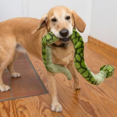 Met zijn groen-zwarte motief, de gele ogen en in de vorm van een echte slang, daagt dit grappige pluche dier uw hond uit tot een vermakelijk duel. Daarbij drijven de squeakers in de kop en staart het speelplezier op. Extra groot en lang, flexibel en zacht, zorgt het pluche dier voor uitgelaten uurtjes en veel plezier. Ook als uw hond zich alleen moet vermaken.