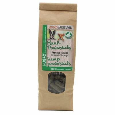 De traktaties worden gemaakt van de zogenaamde perskoek, die ontstaat bij het persen van hennepzaad tot hennepolie. Ze bevatten onder meer omega-vetzuren, die kunnen bijdragen aan een gezonde huid en een glanzende vacht, en vezels om de darmflora te ondersteunen. Bovendien zijn Hugro Hennep Powersticks voor honden rijk aan plantaardige eiwitten, die kunnen helpen de spiermassa te behouden. De hondensnacks zijn gemaakt in Duitsland en dankzij hun voedzame samenstelling zijn ze ook zeer geschikt als voedingssupplement voor verzwakte dieren met verhoogde voedingsbehoeften.
