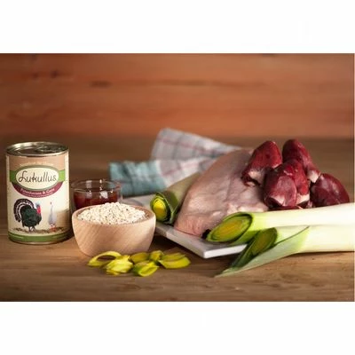 Lukullus natuurkost is een gezonde volwaardige voeding gemaakt van natuurlijke ingrediënten – kalkoenhart & gans met gerst, prei en st. janskruid-olie.