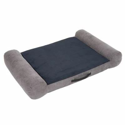 Zacht gevoerde hondenmatras met dikke zijranden en orthopedisch traagschuim, vormt zich naar het lichaam en ontlast de gewrichten, hoes van hoogwaardige meubelstof, kleur: grijs/zwart.