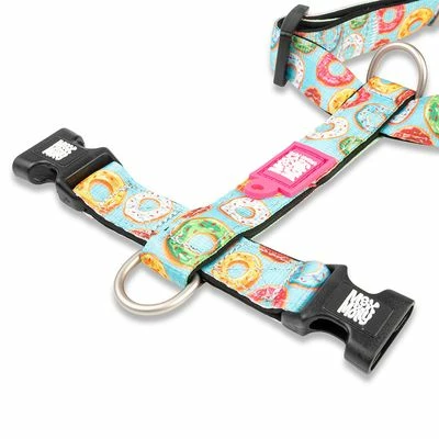 Meervoudig verstelbaar hondentuig met vrolijke donut-print. Aan te passen aan de grootte van je hond. Dubbellaags tuig. Zeer sterke Power-sluiting. 2 D-ringen. Van neopreen & polyester.