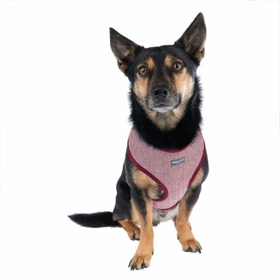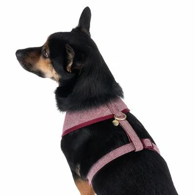 Elegant hondentuig in vele maten, mooi visgraatpatroon, metalen elementen in mat goud, makkelijk aan te trekken, traploos verstelbaar, zacht en ademend, gemaakt van polyester en nylon, kleur: rood.