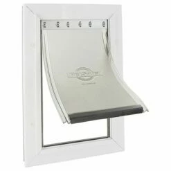 Stevig 2-richtingen-hondenluik van “Staywell” met aluminium frame en een geluidsarme flexibele klep.