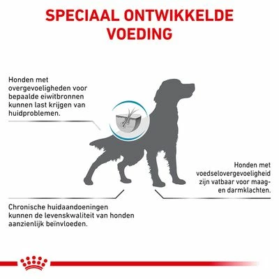 Het maag-darmkanaal en de huid zijn twee zeer sensibele organen van onze huisdieren, die aan verschillende invloeden zijn blootgesteld. Veel honden lijden aan voedingsmiddelonverdraagbaarheden en intoleranties. Allergieën komen voor, wanneer het immuunsysteem van het dier reageert op een onschuldig stofje. Deze reactie kan bij honden een verschillend sterk effect hebben. Royal Canin Anallergenic is een dieetdroogvoer, dat speciaal voor honden met sterk uitgesproken allergieën ontwikkeld is en het ideale voer voor een consequent uitsluitdieet biedt. In het recept worden eiwitbestanddelen met laag moleculair gewicht gebruikt, die allergische reacties op voedingsstoffen kunnen verminderen. Bij de producten en de receptuur wordt er goed op gelet, dat het voer niet in contact komt met voedingsallergenen. Een speciaal synergetisch antioxidantencomplex helpt bovendien vrije radicalen te neutraliseren. Ter ondersteuning van de barrièrefunctie van de huid wordt een gepatenteerd voedingsstofcomplex ingezet.