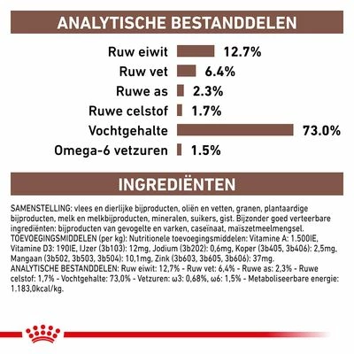 Royal Canin Veterinary Canine Recovery wordt gekenmerkt door een licht verteerbare, goed te verdragen samenstelling. Het dieetvoer is rijk aan eiwitten die belangrijk zijn voor het behoud van de spieren. Dankzij de extra zachte mousse kun je het natvoer op meerdere manieren geven: via een sonde of peroraal met behulp van een spuit. Het natte dieetvoer heeft een heerlijke smaak en wordt dus door veel dieren goed geaccepteerd.