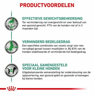 Overgewicht treedt in het bijzonder bij kleine hondenrassen zeer vaak op. Overmatige energietoevoer bij gering energieverbruik en weinig beweging is zeer vaak de oorzaak van overgewicht. Het welzijn van je hond neemt daardoor niet alleen af, maar ook op lange termijn brengt overgewicht de gezondheid van uw hond in gevaar en kan het de levensverwachting verlagen. Royal Canin Satiety Small Dog biedt een volledig dieet speciaal voor kleine honden tot en met 10 kg lichaamsgewicht die aan overgewicht lijden. Dit voer kan ook ingezet worden bij suikerziekte en voor gewichtsbehoud. De receptuur bevat een speciale combinatie aan vezels die het gevoel van verzadiging kan bevorderen. Een verhoogd eiwitgehalte bevordert daarbij ook het behouden van spiermassa tijdens de gewichtsvermindering. Om gebreksymptomen door de gereduceerde energietoevoer tegen te gaan wordt het voer verrijkt met essentiële voedingstoffen en mineralen zoals vitaminen. Daarnaast kan het ook de mond- en tandhygiëne bevorderen.
