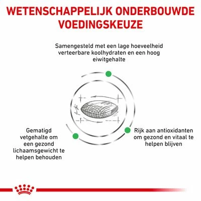 - Hoog aandeel eiwitten: groot gehalte aan eiwitten ter behoud van de slanke spiermassa, wat zeer belangrijk is bij honden met zowel diabetes als ook overgewicht