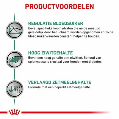 Royal Canin Diabetic Veterinary Hondenvoer ontwikkeld voor de glucoseregulatie bij diabetes mellitus. De voeding bevat slechts weinig koolhydraten die snel tot glucose worden omgezet.