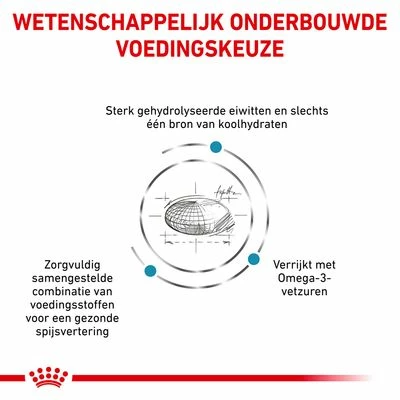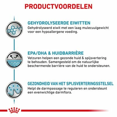 Het dieetvoer voor honden voorziet je hond van gehydrolyseerde eiwitten als geselecteerde eiwitbron, wat betekent dat het een laag allergeen potentieel heeft. Voederintoleranties of -allergieën kunnen gepaard gaan met dermatologische problemen, zoals huidirritatie en -schilfering. Royal Canin Veterinary Canine Hypoallergenic is speciaal samengesteld om de natuurlijke huidbarrière van je hond te ondersteunen. Het bevat ook de waardevolle omega-3 vetzuren EPA en DHA om een goede verteerbaarheid en een normale darmwerking te bevorderen.