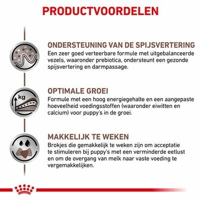 - Makkelijk weken: de GASTRO INTESTINAL Puppy brokjes kunnen zeer makkelijk in lauwwarm water worden geweekt, wat de omstelling op vast voer vergemakkelijkt en de acceptatie verhoogd.