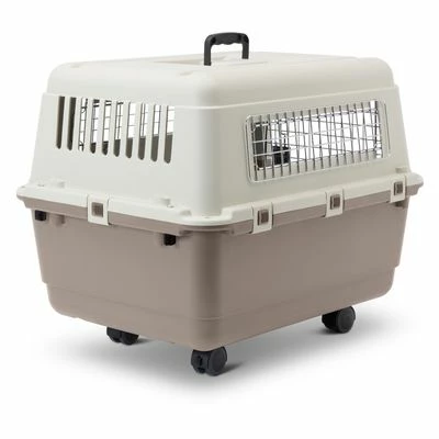 Handige transportbox voor honden. Ideaal voor vliegreizen, met ventilatierooster en afwateringsgroef. Zeer comfortabel, met veiligheidssysteem en kunststof wieltjes.