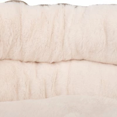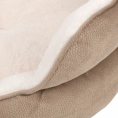 Omdat het gemaakt is van zachte materialen, isoleert het tegen de kou en tegen harde vloeren. De interessante mix van stoffen van olifantenhuid aan de buitenkant en zacht imitatiekonijnenbont aan de binnenkant geeft dit bed een andere touch. Dankzij het feit dat het kussen is genaaid, zal het niet van zijn plaats komen, zelfs niet als jouw viervoeter probeert te graven.