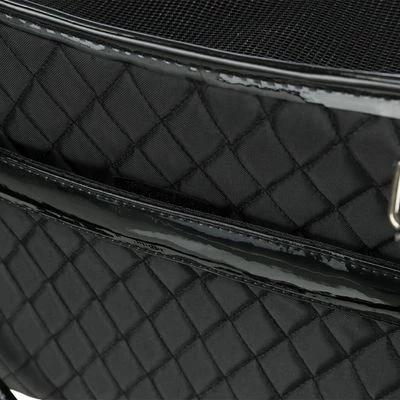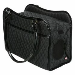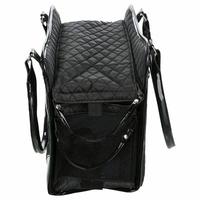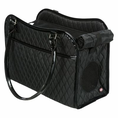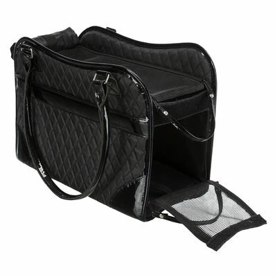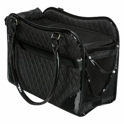 Chique transporttas voor honden tot 5 kg. Voorzien van geïntegreerde korte lijn. Kunstleren bekleding. Met twee openingen. Afsluitbaar mesh aan bovenzijde. Kleur: zwart.