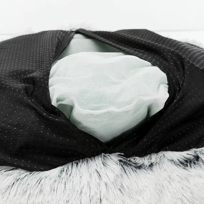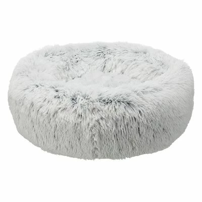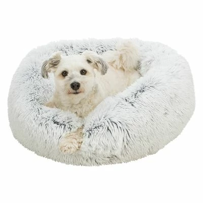 Rond ligkussen voor honden. Extra donzige, lange pluchen hoes. Hoes kan in de wasmachine. Antislip onderzijde. Dik gevoerd voor hoog comfort. Met vastgenaaid kussen. Kleur: wit/zwart.